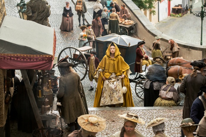 As Claire goes to Master Raymond, she exits the carriage with regal music playing. It’s a perfect fit for her entrance here. And can we just stop a minute and gawk over that saffron cloak and hand painted dress? This is absolutely stunning and sets her apart from those on the street.