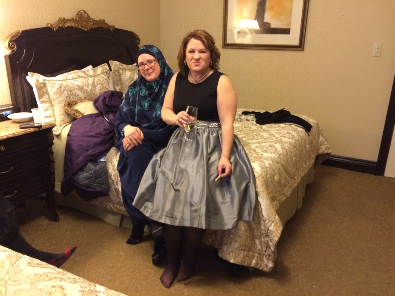 At the reception desk there are envelopes for each of us. White envelopes, this way. We have yellow envelopes, and are directed up a bright, wide staircase, where we meet others both known and new to us in the fandom, replete with sparkles, and cleavage, and upsweeps and once over I discretely exchange my flats for my pink heels.