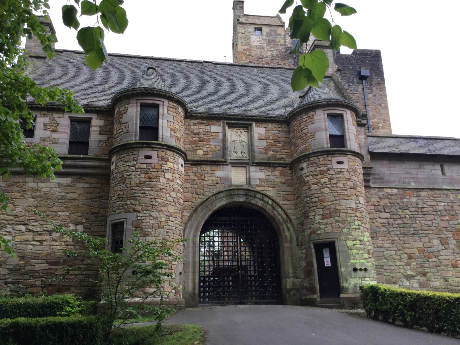 The next morning after a full Scottish breakfast (heart attack on a plate, but so tasty) prepared by my hosts, we set off in search of castles by the sea. But, first we had to make a stop at the Dean Castle and Country Park – on the opposite side of Kay Park, just a mile and a half from the Clark’s home. We know now that the Castle was used as a filming location for Season 2 of Outlander. However, late last year, there had only been some speculation about this. The first weekend of December, 2015, Peter Clark had sent me a note one morning via Facebook to let me know that parents at the local primary school had received notice that the car park there was going to be used for television production trailers and crew trucks and would be off-limits for several days. He knew of my obsession with Outlander and thought I would find this particularly interesting. Indeed I did find it interesting and it was the first clue that the rumors about Outlander filming in Kilmarnock were on point. Of course, I knew I had to report on this for the Outlander Cast Blog, so coaxed Peter to take a walk over to Dean Castle and take some photos of sets and any prep being done for filming. I didn’t know when I asked him to do this that there was a spate of bad weather going on in that part of Scotland. They call it ‘stootin doon’ there – 30 to 40 mile per hour winds and driving rain. However, my intrepid Scottish friend did indeed get some great photos of the sets and props at Dean Castle which turned into this Blog post. Of course, when we visited there together, he wouldn’t let me forget what he had done for me – risking life and limb in horrible weather for the sake of the Blog!! Yep, that’s what friends do for each other.