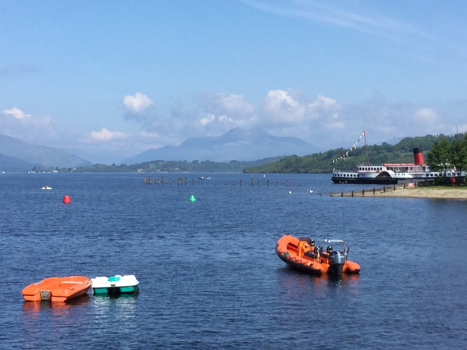 Before calling it a day we took a ride over to the Cameron House – a well-known five-star resort on the shores of Loch Lomond. Again, we encountered a wedding taking place on the lawn in front of the castle-like main building. A well-appointed bagpiper accompanied the bride and her father to the waiting groom and groomsmen – all dressed in traditional kilts. Wonderful to witness. We had a wee cocktail at The Boat House down the road from the Main Hotel and took in more of the glorious views of the Loch and Ben Lomond looming in the distance. Such a nice day.