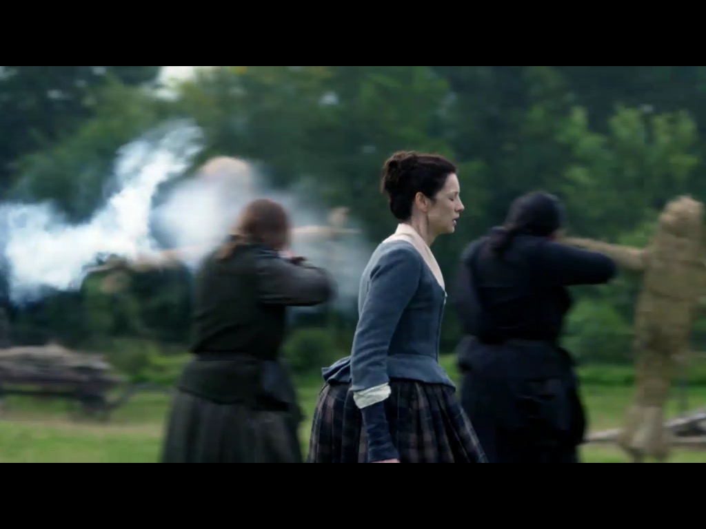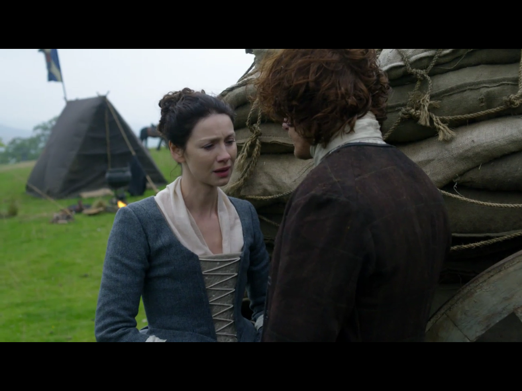 Jamie is also on high alert; as a Highlander and warrior, he seeks warning and safety, and as Claire’s husband, he senses Claire’s moods and needs as instinctively as his actions as a warrior. Broken by way of the trauma inflicted on him by Jack Randall, his recovery hinged on Claire’s determination and love. As his emotional integrity slowly heals, he shifts to Claire’s as hers gives way. Burdened with the knowledge that the impending Battle of Culloden stands to follow the true course of history, Claire’s fears surface. In a beautifully realized scene, we finally see the full context of the snip of the season 2 “Dear God” trailer, as Claire flinches painfully at the sound of each musket shot. Despite watching the trailer an infinite number of times, it gels in a heartbreaking way now.