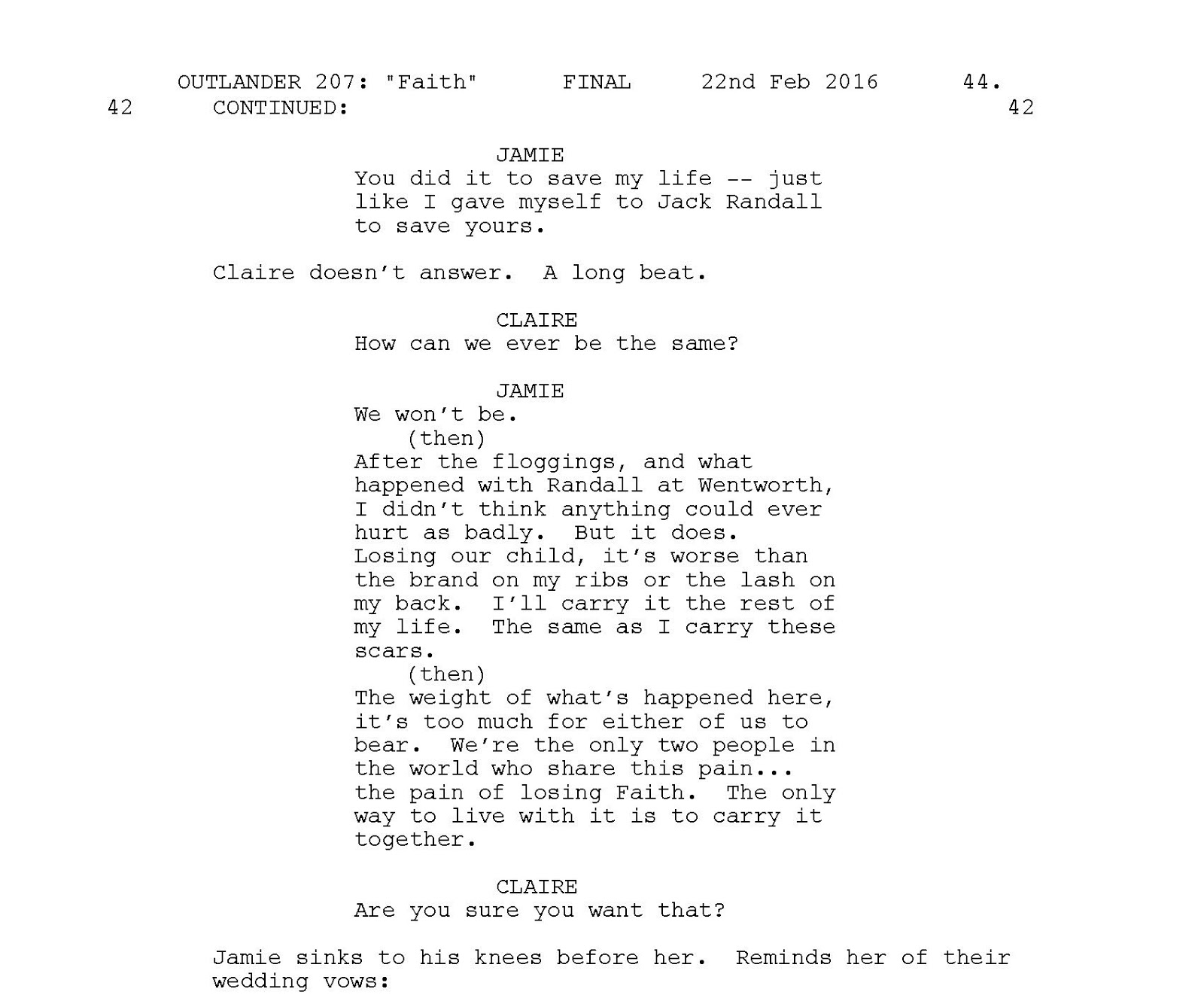 In this last scene, she needed Jamie to guide them back together when she saw no such outcome herself. Not merely just “carrying it together” or going back “to Scotland”, Jamie, as husband and Faith’s father, needed to show the effect on him and remind Claire why and how they are committed to each other. That is what was missing from the aired version. When you consider in context, the emotional connection which was promised but was not delivered when they returned to Lallybroch (EP. 8), this extended scene was exactly what was needed.