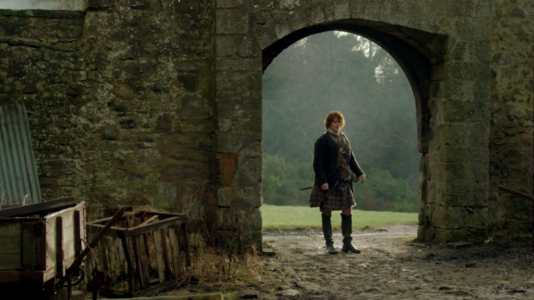 Claire sees an image of Jamie in the entry gate, handsome beyond belief. Is it really him? His ghost? Claire’s memory of him? Is Jamie making himself visible to let Claire know he survived Culloden and is still alive? There are those who believe in a parallel universe where the departed dwell, watch over us, and guide us from where they are. Gone, but not far away. “Random” coincidences or something you swore you saw (really?) could be so much more than your imagination playing tricks on you. You look once and it‘s there. Look again, and it’s gone. The vision may be a sign from Jamie, telling Claire to seek him out, that all is not lost.