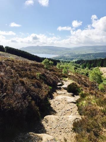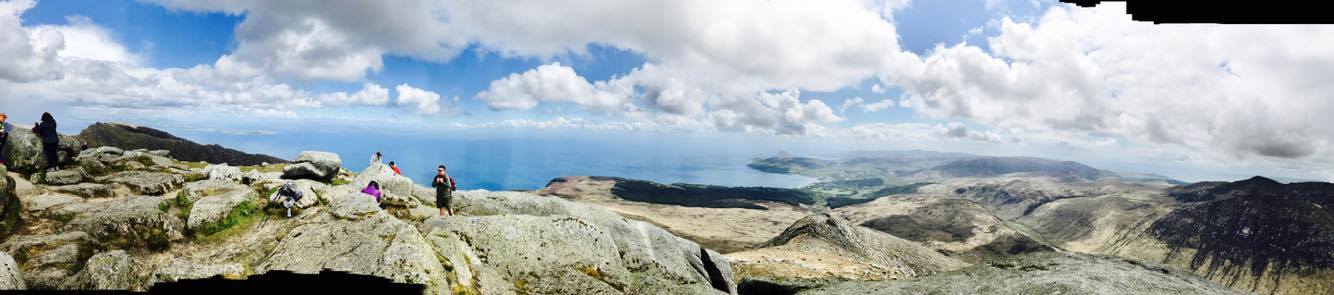 The best part of the lower part of the climb was that the sun, indeed, did come out. So much so, that as we trudged forward and started expending a lot of energy, we all stripped off two to three layers of clothing and by the time we were over an hour into the ascent, we were all down to t-shirts. At this point, my heart was pumping and I was feeling the elevation. But, what I couldn’t really comprehend was that it seemed as if every step I took, I got no further. I knew this couldn’t be true but the mountain just seemed relentless. It went on and on and on. Thinking back, I am guessing this is really just the impression of a novice hill walker. I mean – clearly we were steadily moving upwards, but having never done anything of this magnitude before, it just appeared to me that the distance between me and the summit was increasing not decreasing. Perhaps it was the steady vertical nature of the trail and the lack of few, if any, plateaus. Or, maybe it was that we were over an hour in to the climb and progress just seemed painfully slow. Either way, I was beginning to think that perhaps I didn’t have the stamina to make it. Plus, as I stared at the summit – made glaringly visible by the now brilliance of the sun – there appeared to be no actual trail. Just piles of boulders piled up to a pointed jagged peak. Dave kept saying, “Aye, the trail winds around and takes you to the top.” But, that wasn’t what it looked like to me. How would we navigate that pile of boulders at the peak?