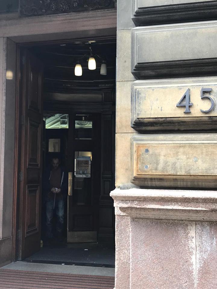 After another trek around the grid, we made our way to George Square. In Outlander parlance, it’s where Claire and Frank impulsively got married. A spacious park makes up the bulk of the square, which is anchored by Glasgow’s municipal hall. It was lunchtime, the sun was peeking through the clouds, and people and pigeons alike were enjoying the day. It was fun to see the filming location at the back of the municipal building and to note the entrance —#45—where Claire slid through the door to her life with husband #1. Outlander geek-out on full display amongst the three of us.