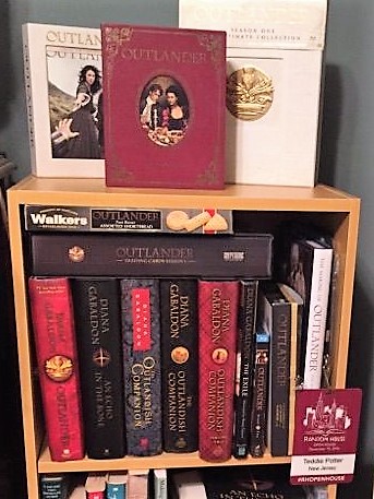 The sad result is that after all that NYC fun, the only thing coming out of this fan woman’s Outlander wallet are those little comic strip flies. For consolation, I head straightaway to my very own mecca of merchandising where my money has been long-spent and, therefore, no longer counts as any kind of expense—my very own Outlander shrine. This is the place where I find my Outlander books and some of Diana Gabaldon’s “methadone list” titles, an unopened 2-year-old box of Outlander Walker’s Shortbread cookies, a nice box of Season 1 Outlander Trading Cards (also unopened), an official Season 1 Trading Card binder (empty), various bits of ephemera from past NYC Outlander events, scraps of the banners that once hung at the now-shuttered St. Andrews Pub, and—gloriously displayed—my Outlander Blu Ray disc sets for Season 1 and Season 2. Time for an everything-old-is-new-again S2 re-watch!