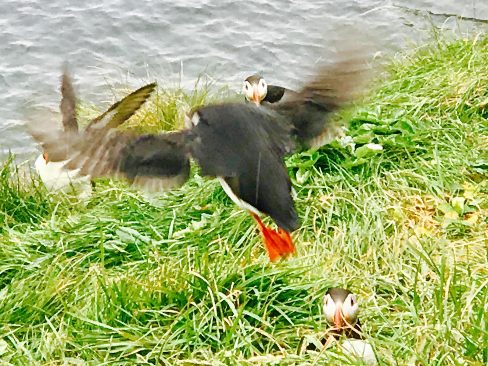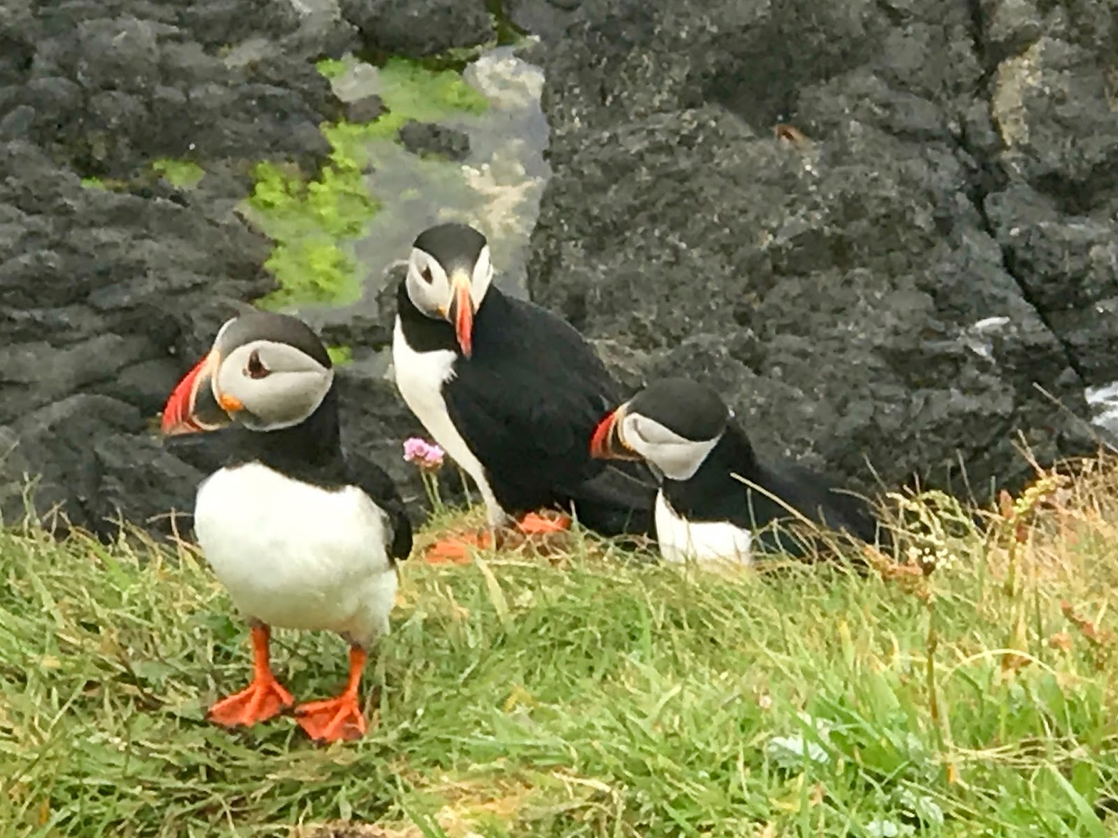 As we crossed the top of the bluff of the island we went in search of the nesting puffins. We had been told that we would find them at the far end of the cliff. We pushed hard to get up the hill knowing we would have only a few minutes with these exotic birds before having to hurry back to the boat. You are allotted only an hour on the island and as we had learned about Scottish ferries, they are generally quite prompt if weather allows. As we topped the last hill, we came upon dozens of puffins cackling and hopping about only feet away. They showed no fear of humans; in fact they seemed to pose as they tended to their nests buried in holes along the side of the steep precipice above the sea. Dozens of people were taking photographs, including some clearly professional photographers with very large lenses. It was pure joy seeing these beautiful birds in their natural surroundings. Every once and awhile one would take off and fly almost straight down and off the cliff. A surreal experience in every sense of the word.