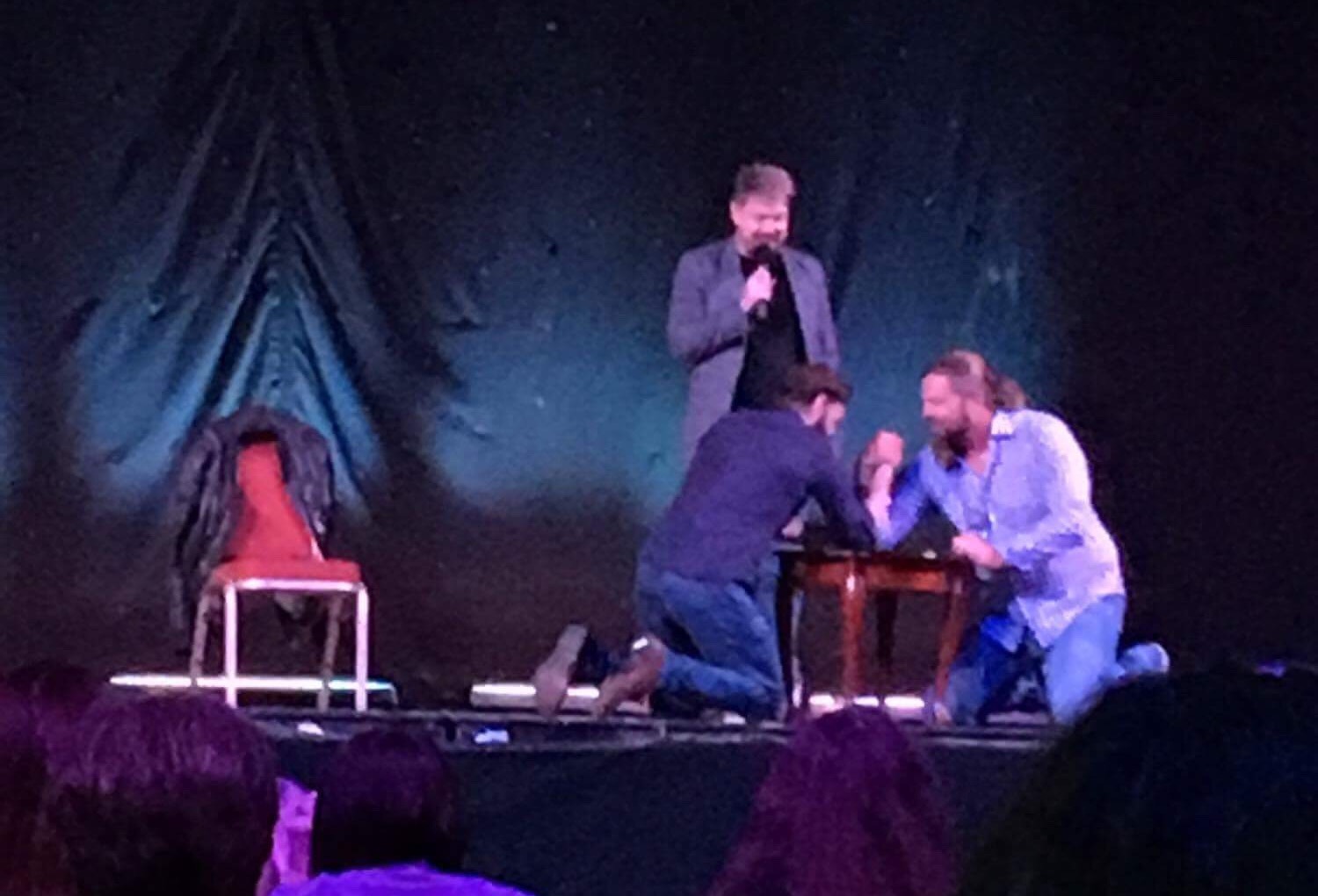 Was he disappointed that Sam Heughan is not here? Yes, especially for a repeat of the arm wrestle they did last year. He acknowledged that Sam does ‘work out a bit’ but he felt sure he could still have a good chance of beating him in an arm wrestle. In the end, he got a Sam substitute up on stage and they had a wrestling match.