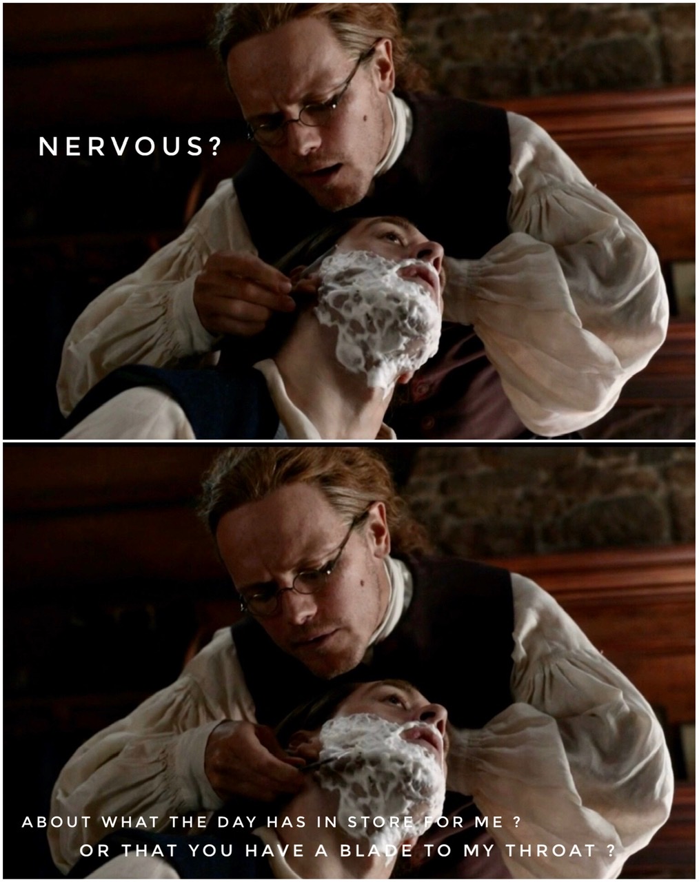 Roger Mackenzie has had his neck on the line since the first few minutes of Outlander Season 5. His father-in-law takes to him with a cut throat razor on the morning of his wedding, with more than a tad of hidden angst between the two. Jamie has not forgiven Roger for taking his time coming back to Brianna, and there is an uneasy detente between them.